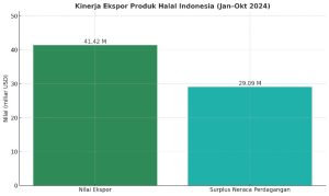 Grafik di atas menampilkan kinerja ekspor produk halal Indonesia selama periode Januari hingga Oktober 2024. Nilai ekspor produk halal mencapai USD 41,42 miliar, sedangkan surplus neraca perdagangan mencapai USD 29,09 miliar. Data ini menunjukkan peran signifikan sektor halal dalam perekonomian nasional dan potensi besar dalam perdagangan global.
