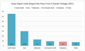Padahal, sebagai salah satu negara dengan populasi Muslim terbesar di dunia, Indonesia memiliki potensi pasar fintech syariah yang sangat besar. Berdasarkan Global Islamic Fintech Report 2024/25, nilai pasar fintech syariah Indonesia tercatat mencapai US$8,5 miliar atau setara dengan Rp142,8 triliun pada tahun 2023. Meski demikian, capaian tersebut masih tertinggal dibandingkan beberapa negara lain, seperti Malaysia yang mencapai US$13 miliar (Rp218 triliun), Iran US$29,8 miliar (Rp499,49 triliun), dan Arab Saudi yang menempati posisi teratas mencapai US$65,4 miliar (Rp1.096,28 triliun). Capaian Indonesia yang masih berada di bawah negara-negara lain tersebut dapat dilihat secara lebih jelas melalui grafik berikut.